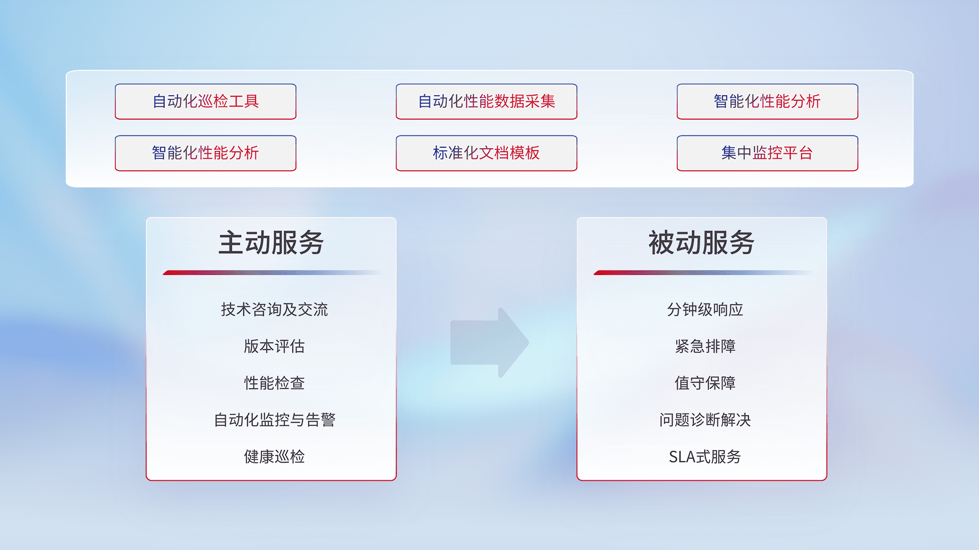 智能化工具和标准化文档,,,,保障服务质量,,,提供主动服务(包含技术咨询、、、、版本评估、、、性能检查、、、自动化监控与告警、、、、健康巡检)和被动服务包含(分钟级响应、、、紧急排障、、、值守保障、、、、问题诊断解决、、、、SLA服务)。。。。