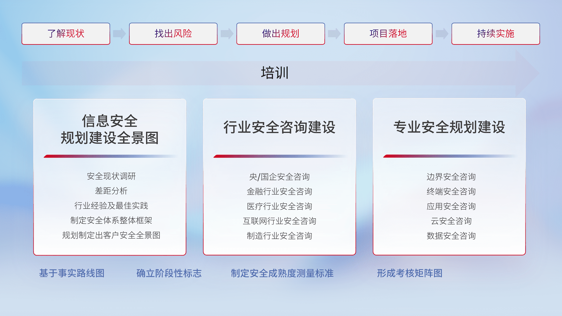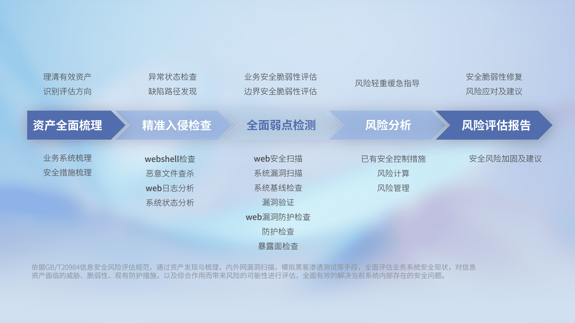 针对客户行业特性,,,以专业的安全服务+多厂商联合解决方案提供专属的一站式安全管理服务,,,,帮助客户全面感知网络空间威胁,,,,基于识别、、、检测、、分析、、、防护、、、、监测、、、响应的服务理论模型,,从方案咨询、、、、集成交付、、、、评估验证、、、、优化加固、、、运维运营,,,致力于为客户提供完整的闭环管理式安全服务。。。。以实战经验为客户打造高抵御风险的安全体系,,帮助客户发现威胁、、、、对抗威胁、、处置威胁,,,,不断积累安全对抗能力,,,,持续保障数字化安全。。